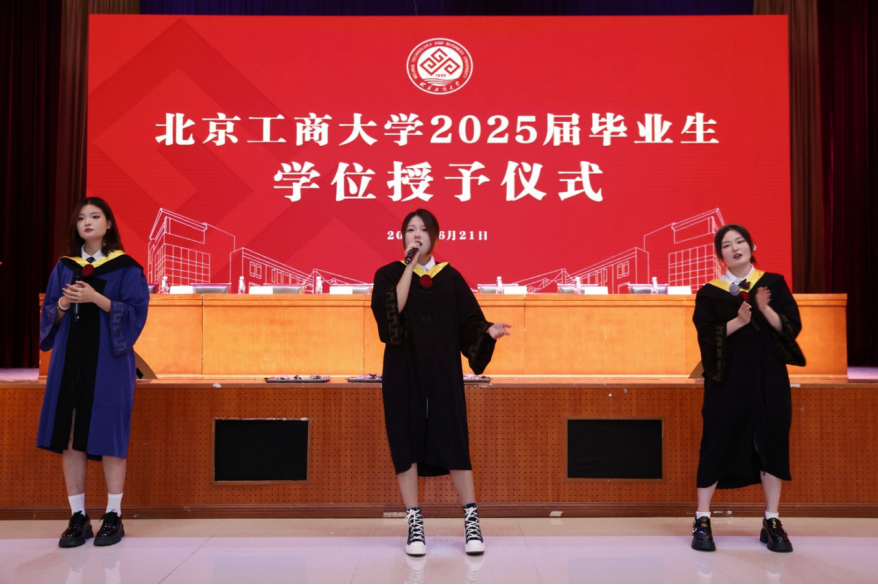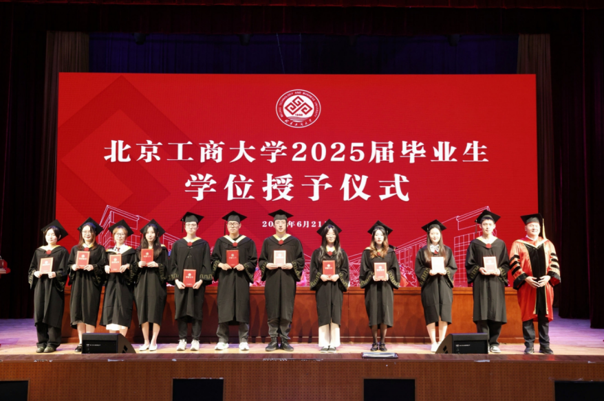 庄严的国歌奏响,毕业典礼正式开始。王彦波宣读《北京工商大学食品与健康学院关于2025届学生学位授予以及表彰优秀毕业生的决定》,学院共有422名毕业生获得学位,其中本科毕业生207名,硕士研究生189名,博士研究生26名(含5名留学生)。15人获“北京工商大学优秀本科毕业生”荣誉称号,18人获“北京工商大学优秀硕士研究生毕业生”荣誉称号,4人获“北京工商大学优秀博士研究生毕业生”荣誉称号,14人获“北京市优秀本科毕业生”荣誉称号,9人获“北京市优秀研究生毕业生”荣誉称号,2人获“北京市优秀博士毕业生”荣誉称号。