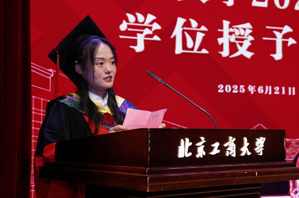 教师代表李赫教授发言。他谈到,教育是彼此映照、彼此成就的生命旅程,教师最大的幸福在于见证学生的成长与蜕变,对毕业生们在疫情反复中坚守学习、在科研攻关中勇于探索的精神给予了高度评价。毕业生不仅为服务国家食品安全与健康中国战略贡献了青春力量,还积极推动了学校食品学科“双一流”建设的稳步前行。2024年食品学子勇夺全国挑战杯揭榜挂帅专项赛特等奖擂主,刷新了学校的历史纪录。2025年我校在U.S.News全球最佳院校排名中再创新高,食品科学与技术跃居全球第9,农业科学提升至第12位,这些成就的背后,离不开每一位学子的辛勤付出与不懈努力。他勉励毕业生珍视求学过程中风雨同舟的伙伴,坚持敢于突破的勇气,激发思维碰撞的智慧,希望毕业生们弘扬学校“工商一体化”的理念,牢记学校“工以开物,商以富邦”的宗旨,勇敢面对未来的广阔与未知,祝愿毕业生“心中有光,不惧路长,脚下有力,行稳致远”。