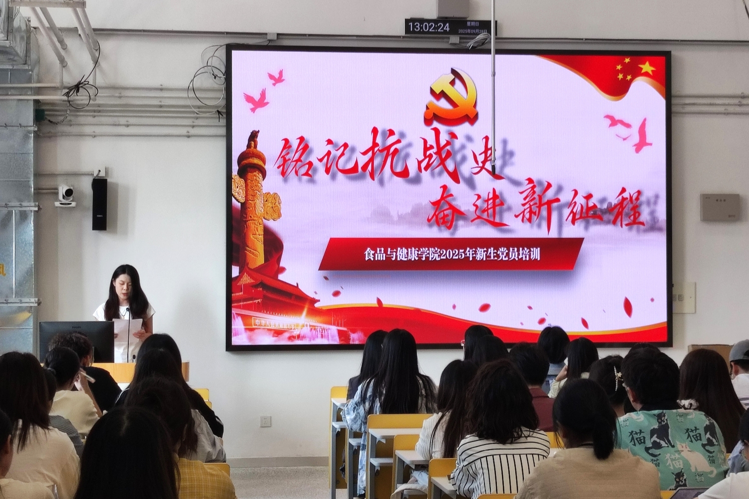 为加强新生党员的党性修养,强化历史使命感与责任感,激发爱国情怀与奋斗精神,在祖国76周年华诞来临之际,食品与健康学院于9月28日在食品大楼组织新生党员培训,开展“铭记抗战史·奋进新征程”主题党日。学院党委副书记熊慧、专职组织员李娜出席活动,活动由研究生新生辅导员赵婷主持。