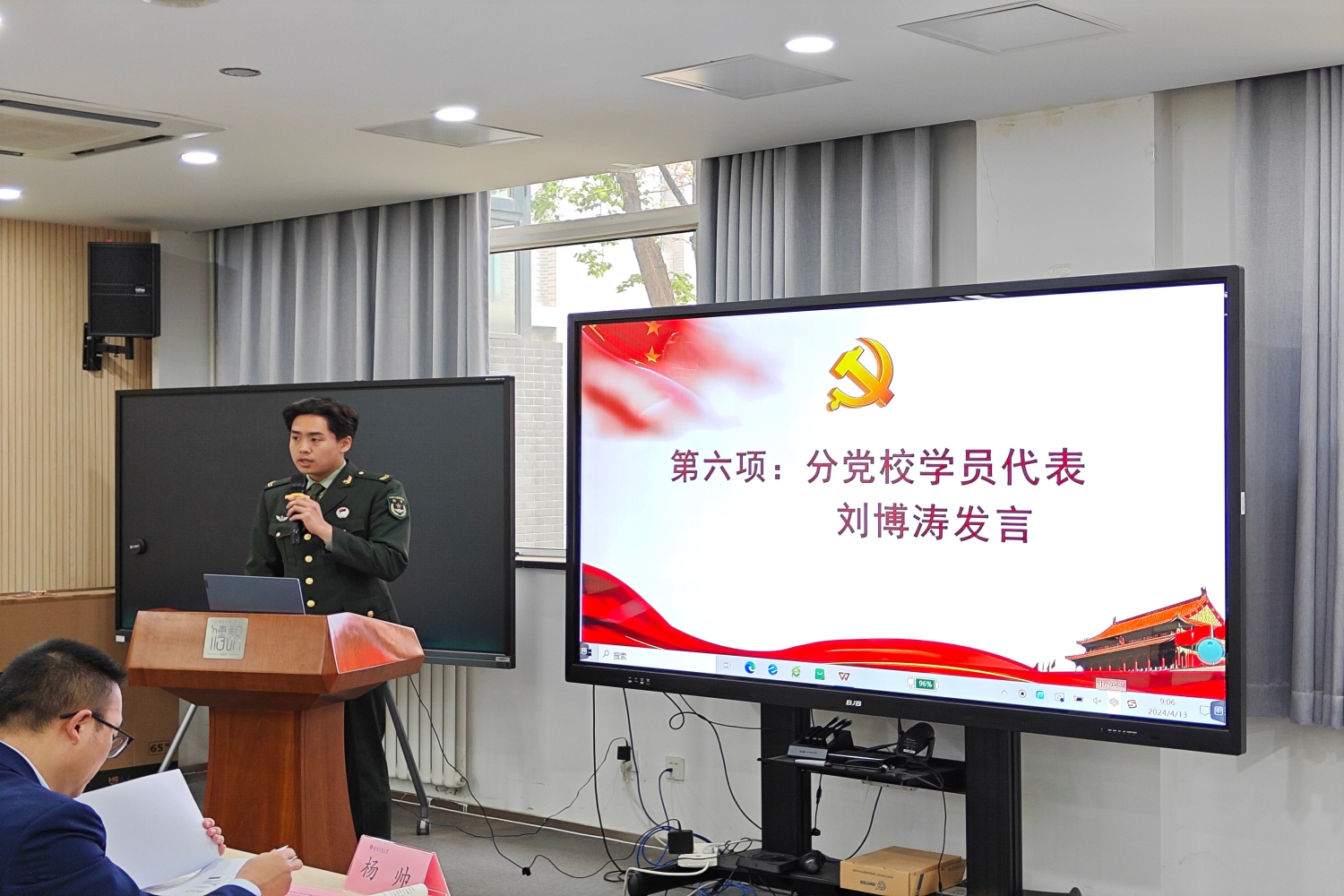 分党校兼职辅导员代表王龙广作为辅导员代表发言,他表示将全力以赴,引导学员们树立正确的世界观、人生观和价值观。入党积极分子培训是提高政治觉悟、党性修养的重要途径,希望大家在学习中深入理解党的性质、宗旨和任务,端正入党动机,真正做到组织上和思想上入党的统一。他还提醒大家要认真学习党的理论知识,特别是关注党内重大活动,深刻领会全国“两会”会议精神,将其内化于心、外化于行。学员代表产设221班刘博涛在发言中分享了自己的军旅经历和对党的深厚感情。他表示,作为一名退伍军人,他深刻理解到党的领导和中国特色社会主义制度的优越性。他承诺将珍惜这次学习机会,认真学习党的理论知识,不断提高自己的政治素养,争取早日成为一名合格的共产党员。他还代表全体学员表达了对学院党委的感谢,并承诺将严格遵守培训班的纪律,积极参与各项活动,争取以优异的成绩完成培训。