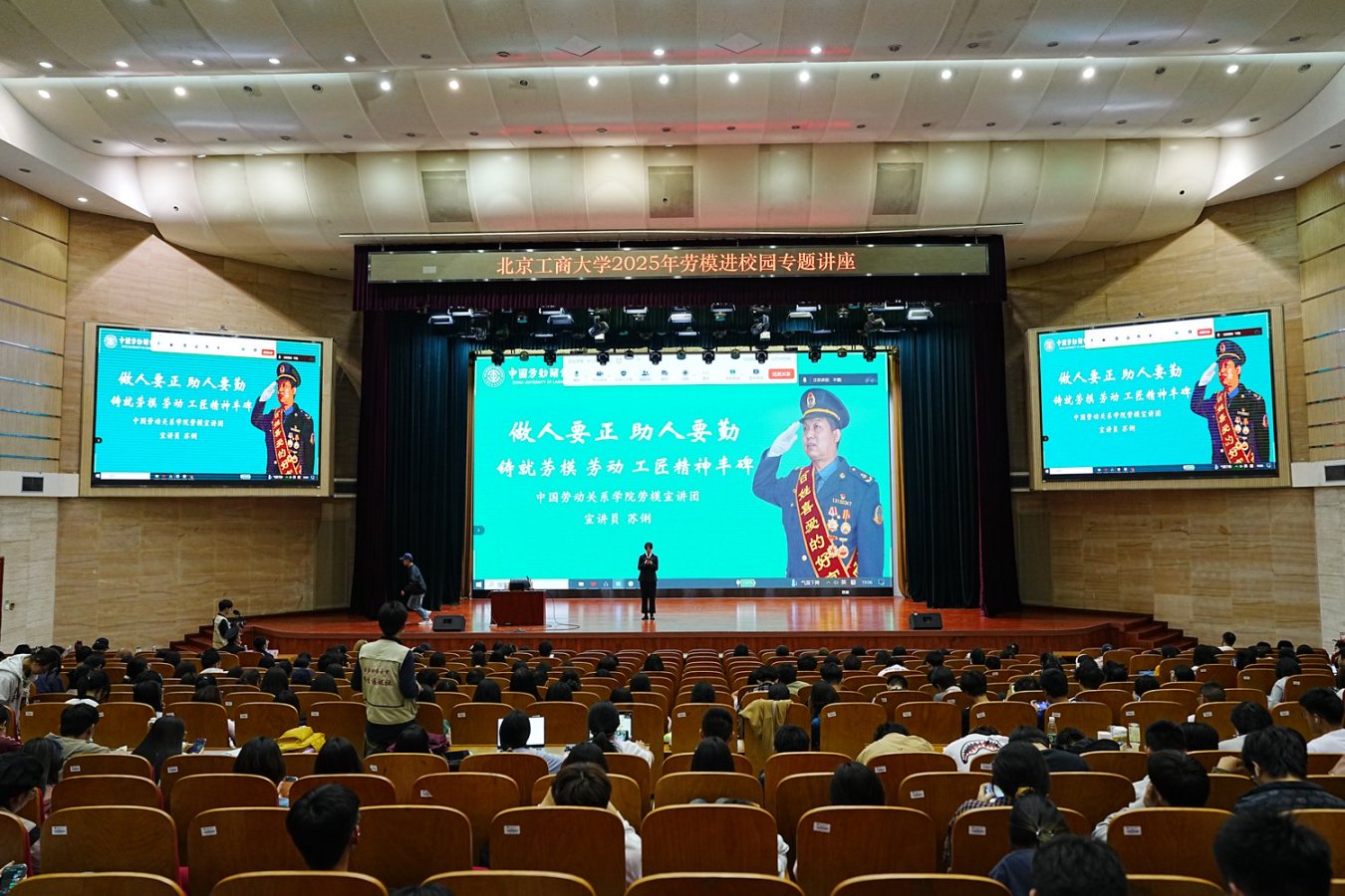 在五一劳动节来临之际,学校在良乡校区举办2025年“劳模进校园”专题讲座。本次活动特邀全国劳动模范代表苏俐、冯丽朝、牛庆花和黎晶为学生讲述自己的奋斗故事,2024级全体本科生参加此次活动。