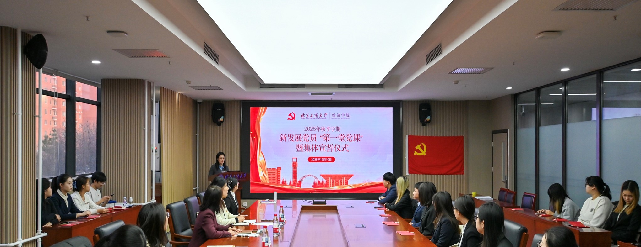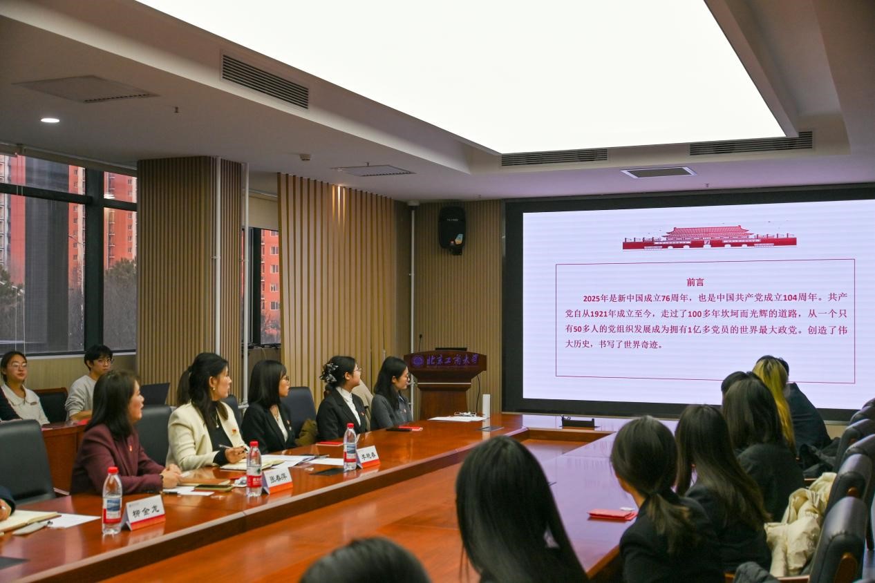 本科生党建工作室组织部负责人杨泽凯介绍学院2025年秋季学期发展对象培养考察情况。在学校党委和学院党委的坚强领导下,我院严格遵循党员发展工作的总体要求,持续优化积极分子培养考察机制,深化《北京工商大学经济学院积极分子“发展积分”制度》的实践运用,构建起多维立体、全程贯通的培养考察体系。秋季学期,经个人申请、组织谈话、积分评定、民主推荐、政治审查及集中培训等严格程序,39 名优秀发展对象在政治素养、作用发挥等方面表现突出,符合党员发展条件,经组织审批发展入党。这批新成员的加入,为党组织注入新的生机与活力。