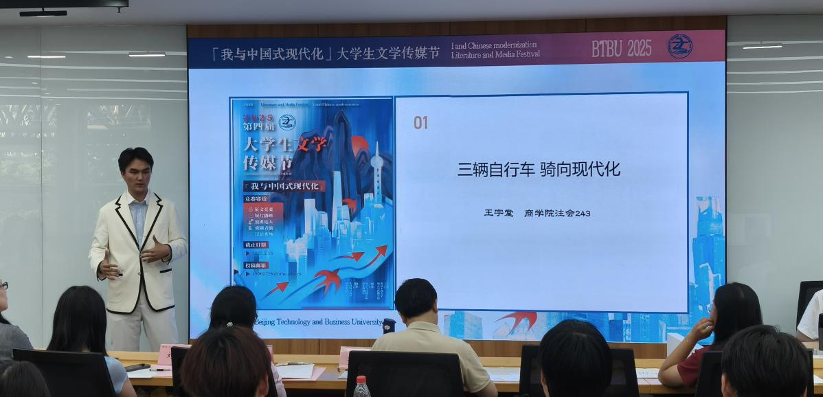 2025年6月18日,北京工商大学第四届“大学生文学传媒节”演讲比赛决赛在良乡校区师生服务中心203教室隆重举行。此次活动由语言与传播学院中文教研室、中国故事叙事研究中心主办,来自全校各个学院的10名选手在历经初赛、复赛选拔后齐聚一堂,以“我与中国式现代化”为主题,声情并茂地讲述了中国式现代化进程中的精彩故事,生动诠释了新时代青年对中国式现代化的深刻理解和独特感悟。