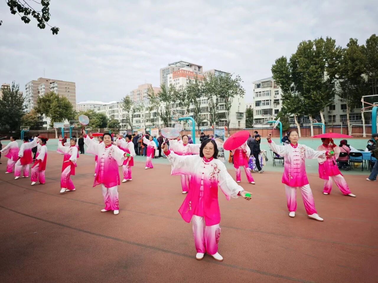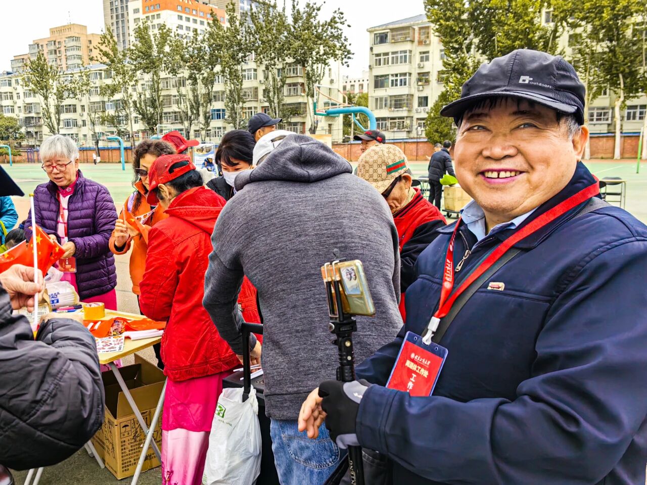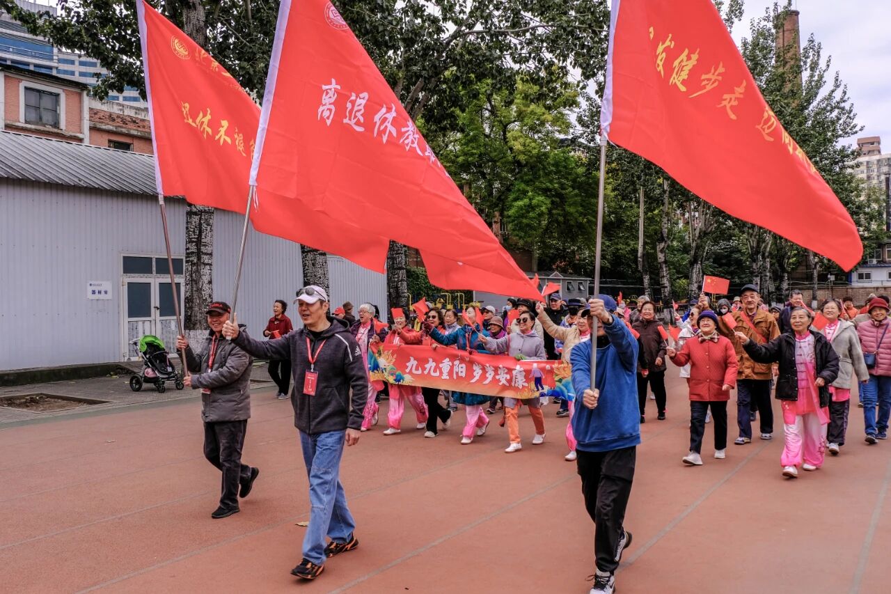 集体健步走成为活动开场的一道亮丽风景线。三名老同志旗手高举“离退休教职工健走团”“银发健步走,迈向新征程”“退休不褪色,乐活新时代”的鲜艳旗帜,迈着稳健的步伐走在队伍前方。沿途播放着《歌唱祖国》《没有共产党就没有新中国》等经典红歌,熟悉的旋律回荡在校园,唤起了老同志们的时代记忆。“一二三四!健康加油!”领队老师夏京春不时带领大家喊出简洁有力的健身口令,老同志们齐声回应,声音洪亮、精神饱满,整齐的步伐与嘹亮的口号、激昂的红歌相互呼应,形成了校园里一道充满活力的秋日图景。大家在操场步道有序前行,舒展筋骨的同时,更感受到集体活动的归属感与幸福感。