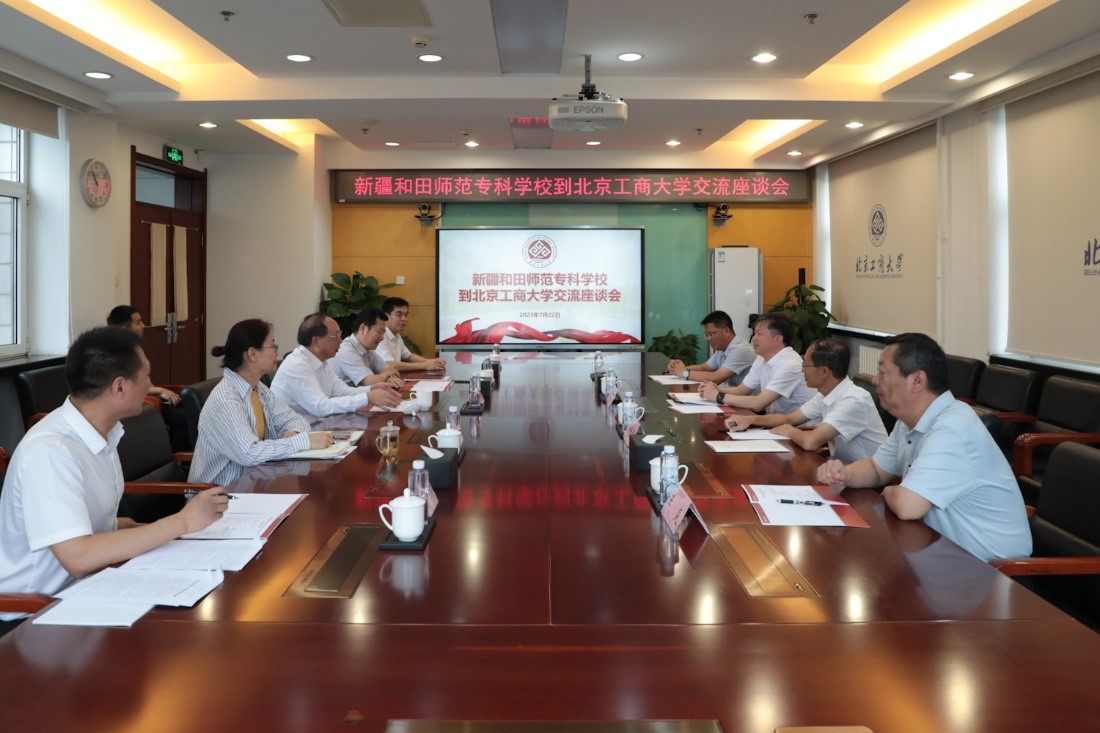 座谈会上,双方观看了学校宣传片。黄先开对和田师范专科学校来访表示热烈欢迎,并介绍了学校的历史沿革、办学特色、目标定位。他表示,北京工商大学作为北京市重点建设的高水平研究型大学,形成了“理工+经管”的工商发展新模式,明确了“商科做强、工科做精、工商融合、双轮驱动”的学科专业布局定位。他建议两校相关部门通过精准对接以及对口援疆等方式,促进和田师范专科学校升本工作,同时在专业建设、人才培养、科学研究等方面加强交流合作。
