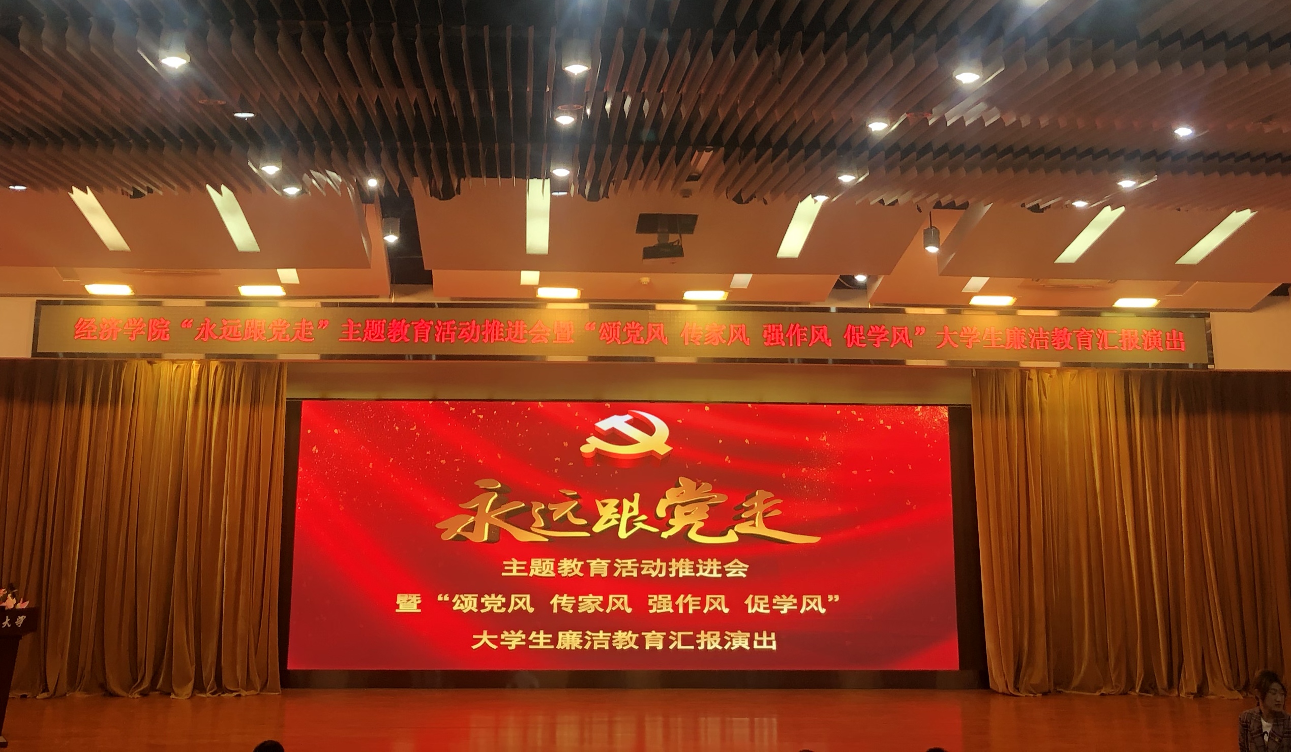 5月7日,经济学院在良乡主校区举行“永远跟党走”主题教育活动推进会暨“颂党风 传家风 强作风 促学风”大学生廉洁教育汇报演出,学校办公室主任祝钧、学生处副处长许峰参加活动。经济学院领导班子、全体辅导员以及学生党员、发展对象、积极分子300余人参加此次活动。