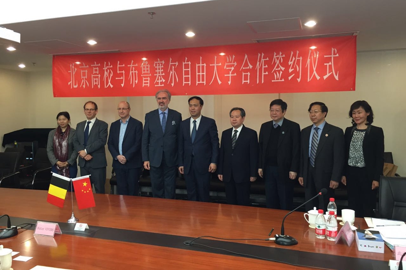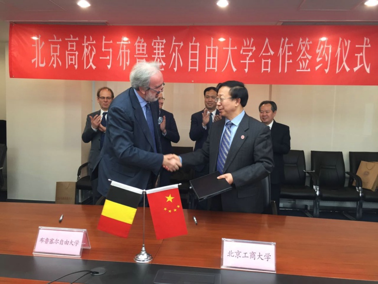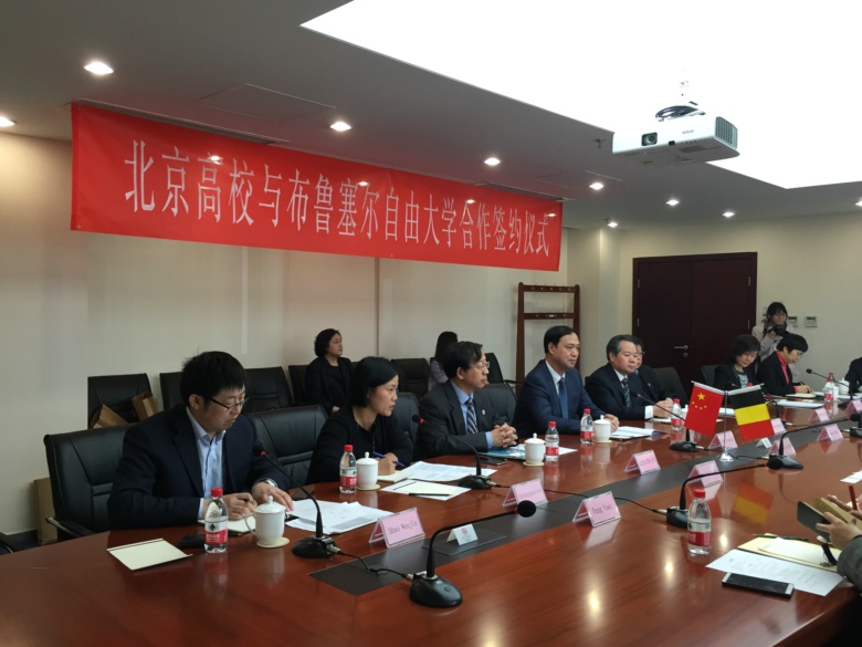 在北京市教委领导与市属多所高校的领导见证下,我校同比利时布鲁塞尔自由大学签订了校际合作协议。签约仪式后,孙宝国校长与比利时布鲁塞尔自由大学校长进行了亲切友好的交流。
