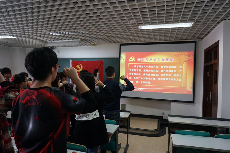 学生党支部以“认真学习党章、落实忠诚信仰”为主题开展微党课活动。会上,全体学生党员重温入党誓词,大家伴随国歌,面对党旗,庄严宣誓,以饱满的精神面貌开始了学习交流。大家就“如何学好党章党规”这一问题进行了热烈的讨论,得出了四点共识:“认真学习、自觉遵守、切实贯彻、坚决维护”,大家在轻松愉快的氛围中感悟着党章的深刻内涵,坚定了共产主义信仰。