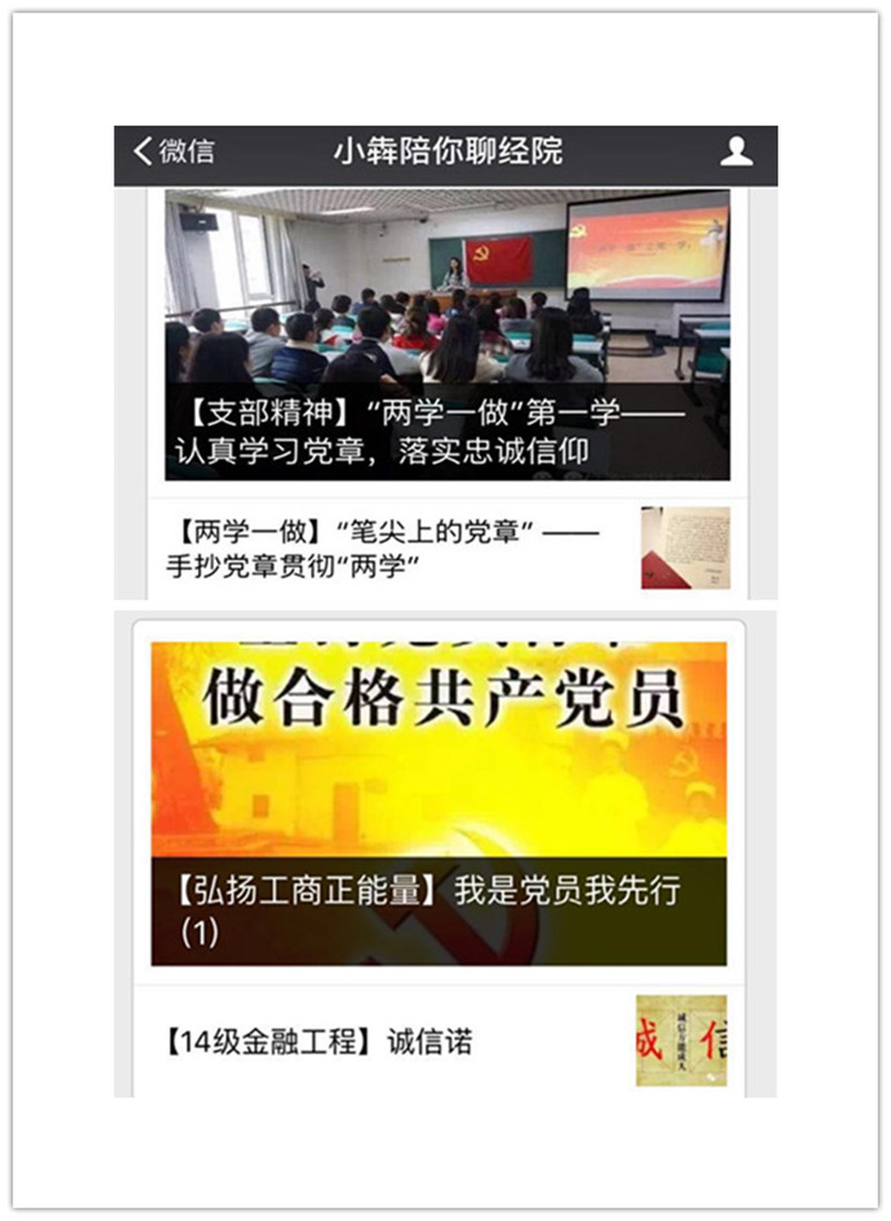 学生党员勇于“发声”,通过学院微信平台“小犇陪你聊经院”,每天推出一期学生党员“弘扬工商正能量”公益语音活动,由学生党员录制1分钟微音频,围绕尊师重道、感恩父母、卫生宿舍、文明礼仪、节约用水、安全用电、走下网络、走出宿舍、走向操场等为主题展开“发声”号召,通过线上线下互动结合,向在校学生弘扬工商正能量,传播核心价值观。