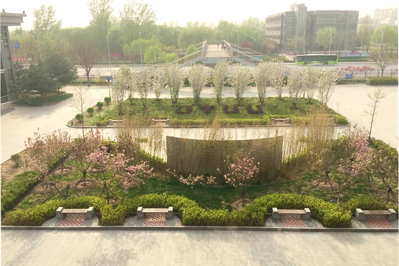 答:通过改造,书影叠翠景观群实现了不同角度景观不同,而又都围绕书的主题。其中,圆弧形书墙宛如一册打开的书,而自东向西看又像一册合上的书。同时,在后期我们根据征求到的艺术与传媒学院广告学专业学生的建议,在南侧种植黄杨、紫薇,站在过街天桥上看,书墙南北整体又宛似一册我国传统的线装书,三叶草区域像装订区,黄杨球和紫薇如同装订线;而自南向北看,则像是一册翻开的书,中间的道路则化为书脊。