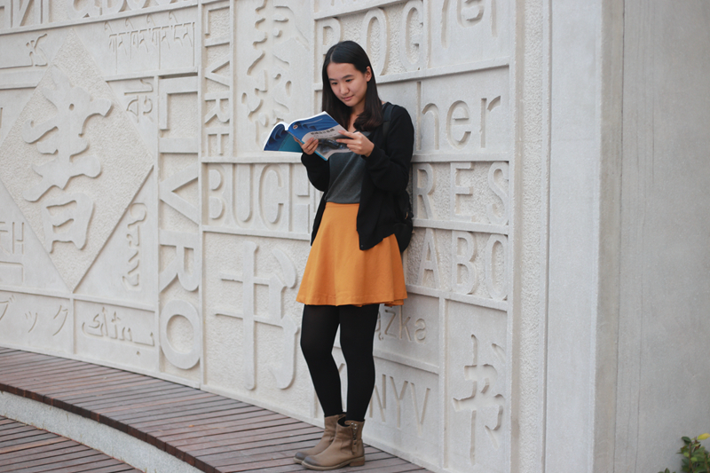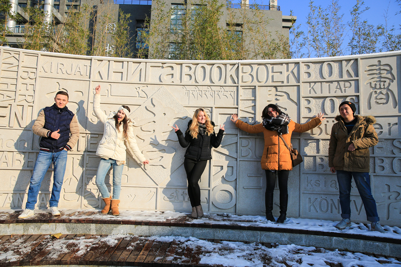 答:确实,这么多的文字收集起来很不容易,但是在全校师生的大力配合下,我们在获取文字的同时,收获更多的是感动。比如国际交流与合作处的刘影老师多次组织留学生将各自国家的“书”字,誊写好交给我们参考;艺术与传媒学院的郑子云老师几次专程到现场研究各种自然光线下墙体的整体色彩变化;外国语学院任玉芝老师更是在早班车上得知我们设计这一作品,施工阶段还几次提醒我们注意俄文最后一个字母的特殊写法。
