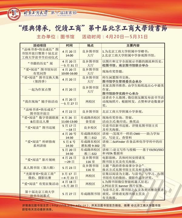 读书节活动将从4月20日持续到5月31日,按照“传统与创新相结合”的思路,既保留了往届经典品牌活动,包括“爱阅读”数字资源联展、信息达人比赛、图书馆知识有奖问答、图书交换大集、科研指南系列讲座、影片展映、图书巡展、“光影青春悦读工商”摄影微拍大赛和真人图书馆等活动,同时,将推出一系列全新互动活动,如“我在现场随手拍”鼓励读者利用微博、微信进行读书节活动的现场直播,让参与者互动进来,让未到场的读者也能及时了解活动进展,感受活动氛围;“一起为作家点赞”通过推荐名家及图书,由学生贴纸选出心中最美的作家,领略名家风采,感悟书香魅力;“爱阅读”征集活动,面向全校师生为图书馆微信智能机器人征名、为网站主页征图,塑造图书馆简明生动的形象,增强图书馆与师生的贴近性,鼓励更多读者了解和使用图书馆的资源与服务。