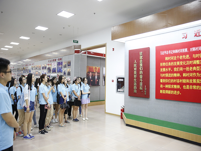 下午,实践团成员来到了韩村河村史馆参观,并开展了“争做服务先锋,向党旗献礼”主题党日活动。踏过鲁班大道,漫步在乡间的小路上,人与自然和谐共处的山村美丽而安宁。韩村河村正在向建设人与自然和谐发展的生态小康型新农村迈进,展示了和谐社会的灿烂前景。