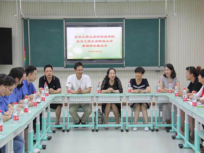7月16日,外国语学院领导班子前往附小,亲切慰问实践团成员,并与附小领导老师及实践团代表展开暑期师生座谈会,针对本次暑期社会实践活动以及双方后续的合作发展方向进行了深入探讨与交流。与此同时,外国语学院实践分团与北工商附小四、五年级的80名学生大手牵小手,正式开启了为期五天的暑期英语夏令营。