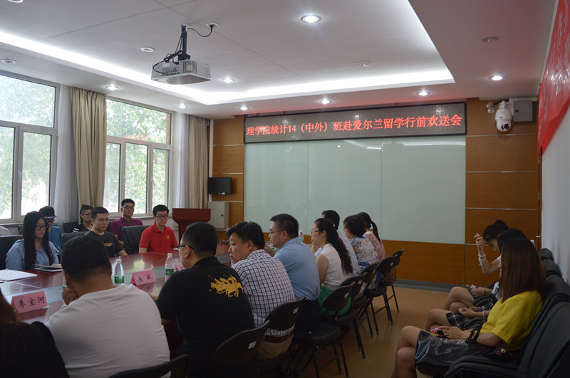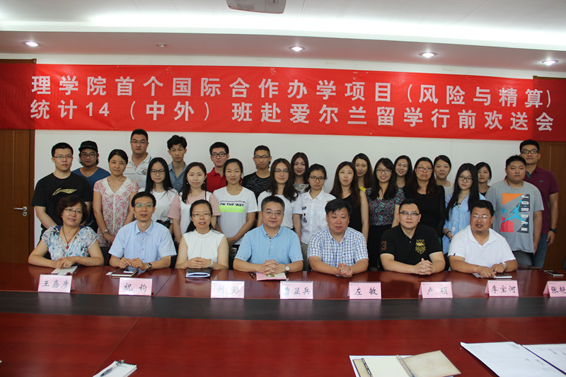 8月19日,理学院举办了学校首个国际合作办学班-统计14(风险与精算)中外班赴爱尔兰留学行前欢送会。学校国际合作处处长刘影、教务处处长左敏、爱尔兰UCC中国办公室副主任卢硕、高丝雨以及理学院院长曹显兵、党委书记祝钧、副院长李宝河、党委副书记王嘉彦、国际合作项目相关教师以及出国学生参加了会议,会议由曹显兵主持。