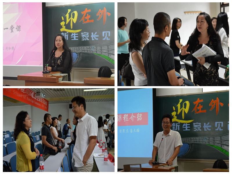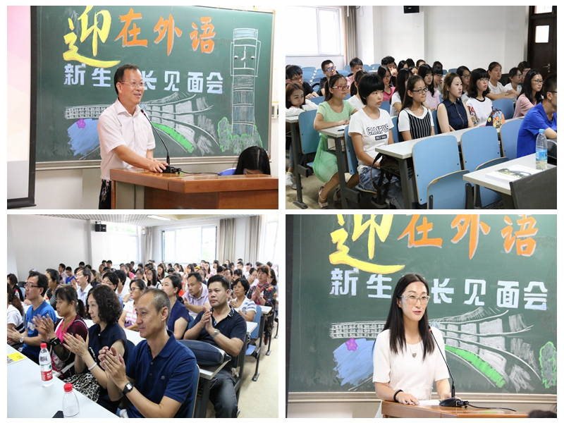 9月3日下午,2016级新生家长见面会顺利召开。本次见面会共分为五个环节。在“启发Enlightenment”部分,院长刘红艳向家长和同学们致以诚挚的欢迎,介绍了外国语学院的基本情况和专业学科优势就业前景。同时,对学院丰富的出国交换项目进行了细致讲解。在“英语English”环节中,副院长苗天顺详细的介绍了商务英语专业学习、学校的千人大考、英语考试奖励、以及学校“369”目标等。在“鼓励Encouragement”部分,党总支书记罗朝能书记叮嘱同学们在大学学习中要讲求自律,切忌懒惰,提升自主学习意识并提醒同学们要加强锻炼,保持身体和心理的双健康。党总支副书记任金晶向大家通报了学院在安全与心理教育方面的工作安排,同时介绍了丰富多彩的学院活动,并对安全问题进行了强调,提醒同学们在学校要时刻树立安全意识。在“热情Enthusiasm”的交流环节,英语142班的屈宁鸥向新生分享了她在大学成长中的经历并勉励同学们珍惜大学生活,活出精彩!2016级李雪霏作为新生代表上台发言,回望了自己成长的点点滴滴,并对未来表达了自己的展望和期待。师生和家长共同欣赏了“环境Environment”部分的学院介绍精彩视频,视频展现了外院学子积极的精神风貌和学院国际化的办学特色,增进了新生对学院的了解和期待。