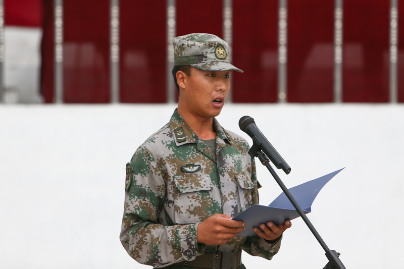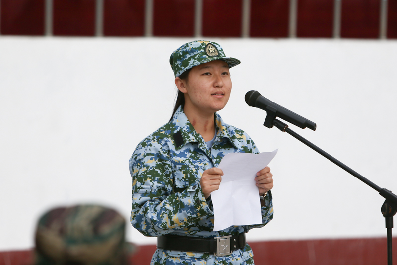 来自商学院注会163班康静同学代表全体参训学员发言。她首先表达了对教官和老师们的感谢,谈了对军训重要意义的理解和参加军事理论课学习的感受。她代表所有参训学员向教官、老师庄严承诺:军训期间发扬不怕苦、不怕累的革命乐观主义精神,以积极快乐的心态对待军训;坚决服从命令、听从指挥、严守纪律,服从教官和老师的管理;严格训练,提高标准,争先创优,高质量的完成所有军训科目。