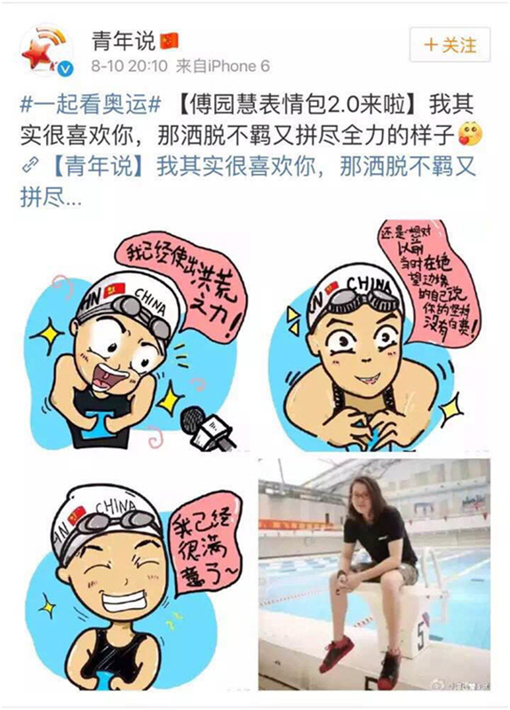 里约奥运会上,中国游泳健将傅园慧成为国人津津乐道的人物,与之相关的“表情包”在互联网广为传播。共青团北京市委员会官方微博及公众号“青年说”,也于第一时间推出了一组卡通版的傅园慧表情包,得到了网友大量转发与点赞。这些表情包就出自我校艺术与传媒学院2014级5位学生之手。除了傅园慧卡通表情,他们的设计创业团队“北京兔儿爷设计工作室”还为共青团北京市委员会设计了其他奥运健儿的卡通表情,同样受到了广泛关注与好评。