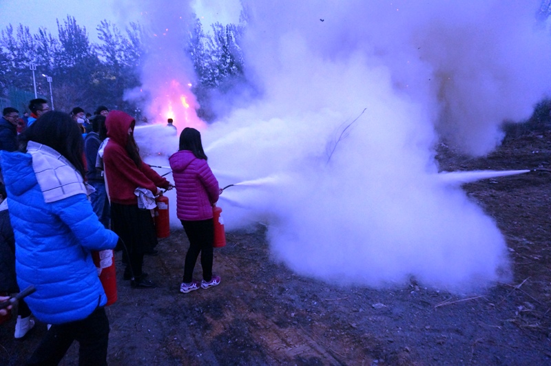 16:30,随着张耘副校长的一声令下,消防演习正式开始。此时,8号楼警报鸣响,烟雾滚滚,800余名新生分别从各自宿舍迅速而有序地疏散到集结区域。参演学生根据在消防培训中学到的知识,以毛巾掩住口鼻,弯腰快步地从烟雾中撤离到指定地点。模拟现场非常逼真,疏散过程紧张而有序。现场还设置了消防逃生体验帐篷、高空云梯救援、体验穿戴消防战斗装备等。消防战士还讲解和示范了灭火器使用方法。随后,保安人员点燃了火堆,参演的师生亲身体验了用灭火器灭火的实际操作,取得了良好的演练效果,也达到了预期的教育目的。