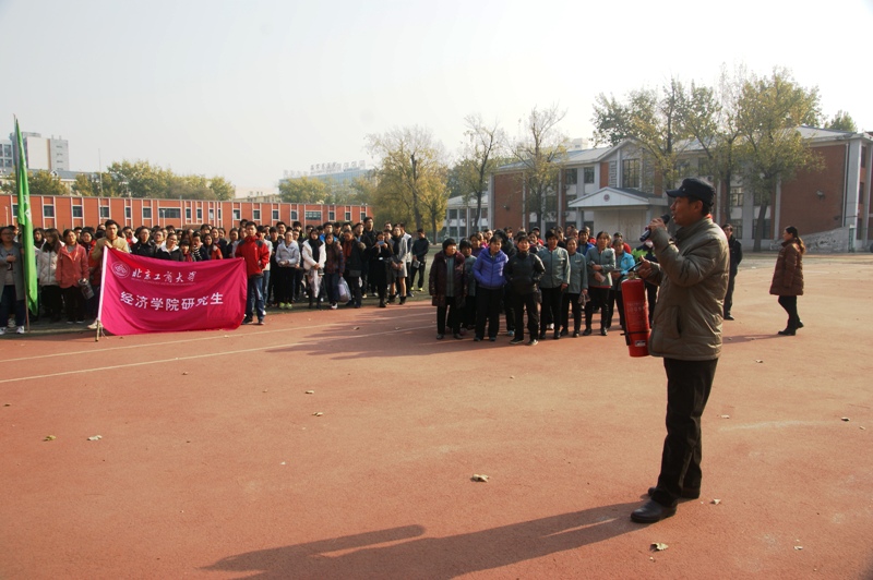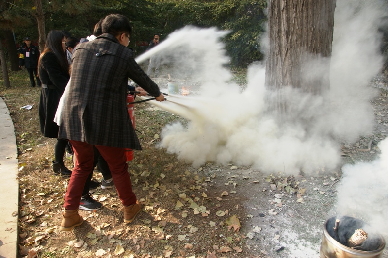 13:00,随着总指挥保卫处处长顿劲松的一声令下,消防演习正式开始。此刻,警报鸣响,烟雾滚滚,来自研一、大四的学生以及后勤、物业人员近550人以毛巾掩面,快速而有序地从烟雾中穿过,疏散到指定场所。随后,在执行指挥杨东杰的示范指导下,参演师生分别在操场火堆前用灭火器进行了灭火练习,演习活动取得圆满成功。