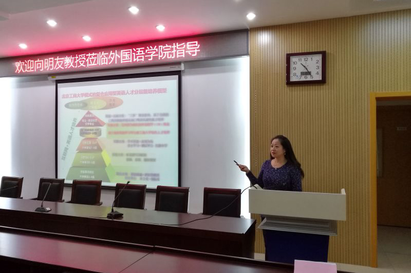 11月16日下午,外国语学院在阜成路校区举办《对话专家:北京工商大学模式的复合应用型英语人才分层级培养座谈会》,邀请北京航空航天大学外国语学院院长向明友教授来学院指导。院长刘红艳、党总支书记罗朝能、副院长苗天顺、副书记任金晶及50余名教师参加了座谈。