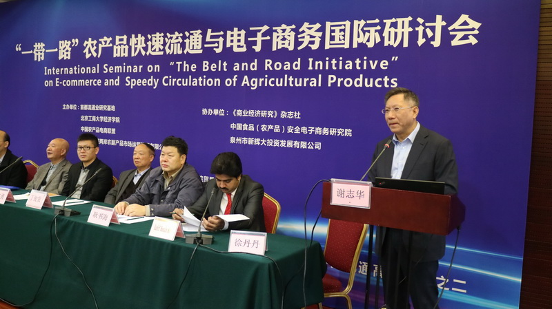我校副校长谢志华教授作为首都流通业研究基地主任、首席专家为大会致辞,他充分肯定了本次会议紧扣 “一带一路”国家发展战略,着重研讨我国农产品的快速流通与电子商务发展的主题,并对与会的全国各地的政产学研代表表示了最热烈的欢迎。泉州市新辉大投资发展有限公司总经理吕杰勇先生代表会议协办方,重点介绍了其投资兴建的“一带一路”农副产品集散中心和电子商务产业园区对农产品物流与电商发展所起的平台作用。