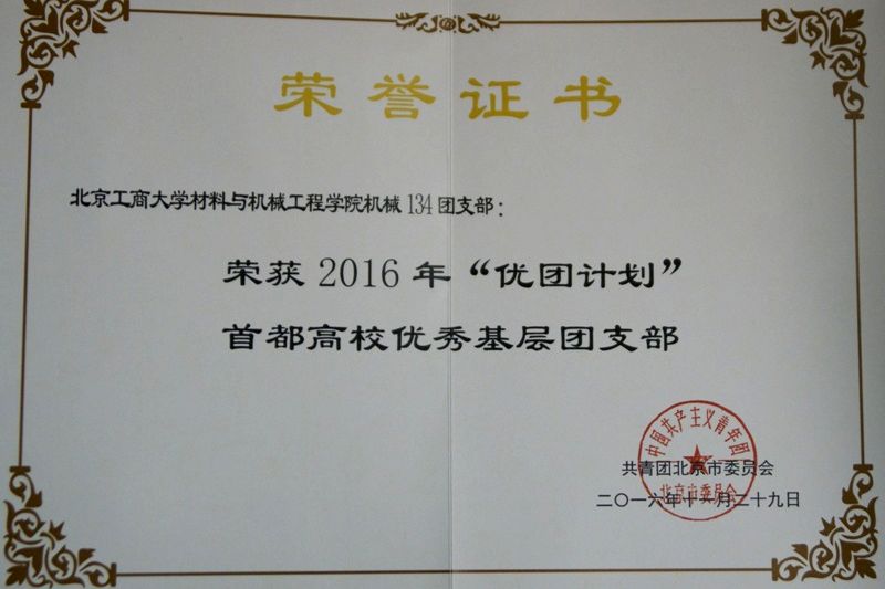 11月29日下午,2016年“优团计划”首都高校优秀基层团支部评选总结表彰会在中国人民大学举行。在校团委的组织推荐下,我校材料与机械工程学院机械134团支部荣获2016年“优团计划”首都高校优秀基层团支部。