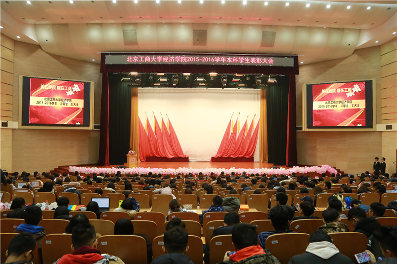 为表彰先进,倡导良好学风,12月21日,经济学院举行了2015-2016学年本科学生表彰大会。学生处处长吕素香、学院领导徐丹丹、张正平、郭馨梅、张伟、罗玉波、杜亚辉与各系主任、班主任、辅导员、16级全体学生以及各年级获奖代表500余人参加了大会。