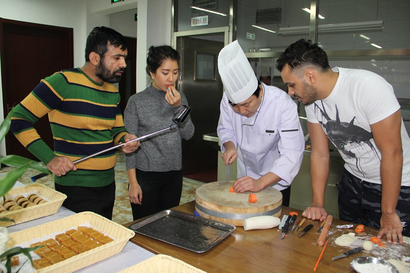 随后,我校的面点师傅给外国留学生展示了精美的手工蔬菜雕花和面点技艺,外国留学生对栩栩如生的工艺品赞不绝口,纷纷表示要向师傅拜师学艺。技艺展示后,包饺子活动正式开始。