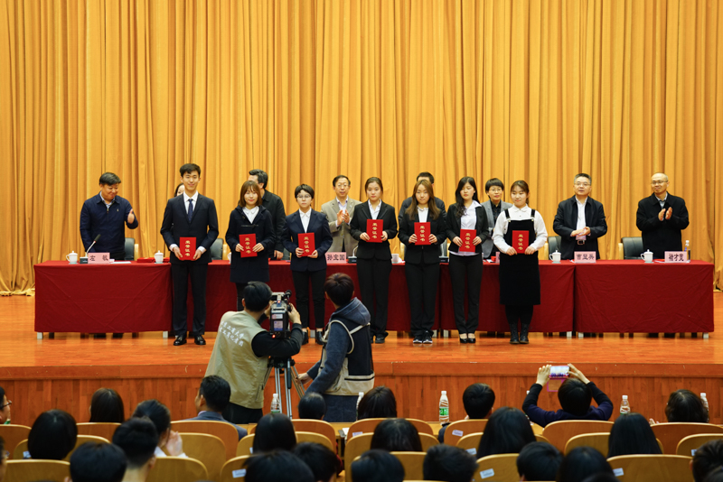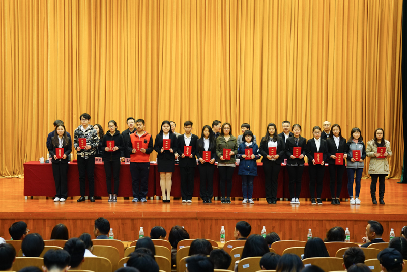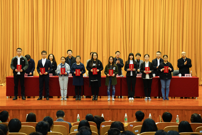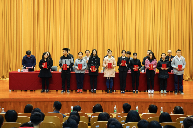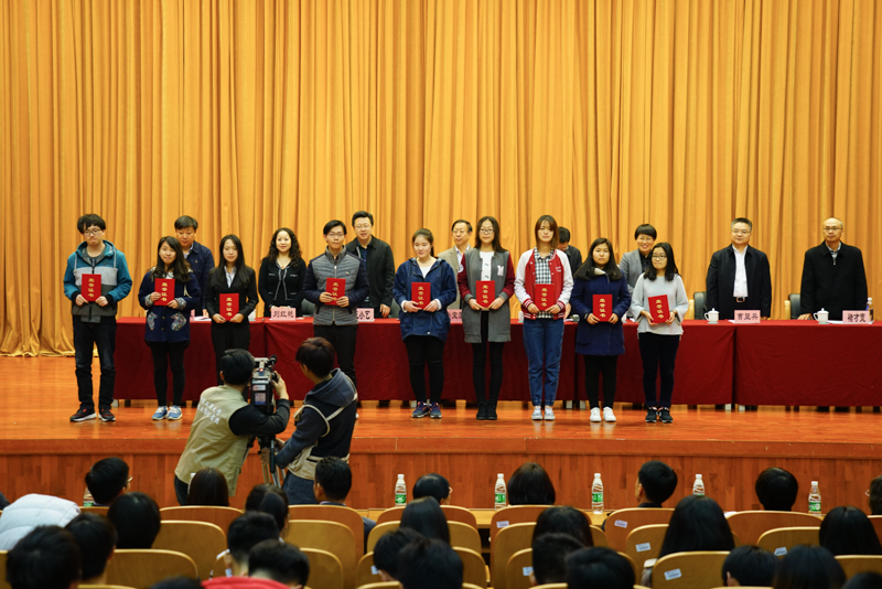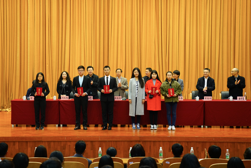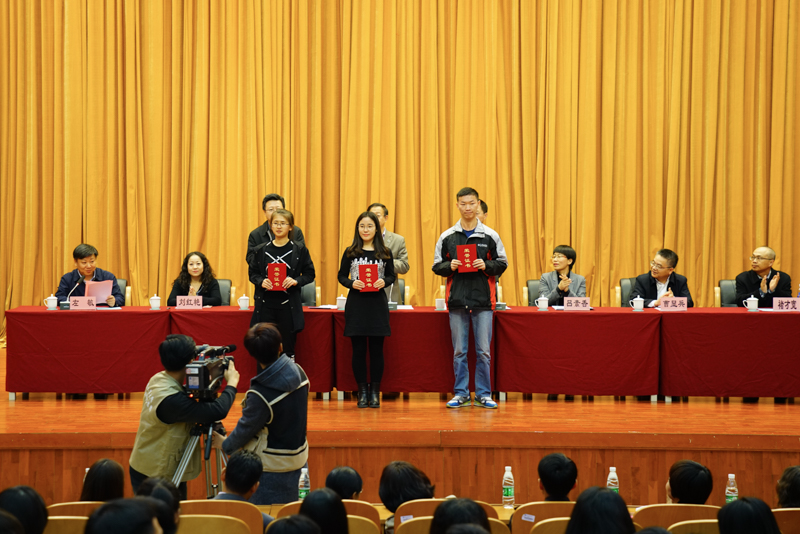 副校长李朝鲜宣读了《北京工商大学关于表彰2016年12月份全国大学英语四六级考试成绩优异学生及2016年秋数学竞赛获奖学生的决定》。此次学校表彰了114名大学英语四六级考试成绩优异的学生,其中英语四级一等奖7人、二等奖15人、三等奖25人、优秀奖64人,英语六级优秀奖3人;表彰了25名在美国大学生数学建模竞赛、国家大学生数学建模竞赛、国家大学生数学竞赛中获奖的学生;还表彰了90名在校内数学竞赛中获奖的学生。在师生们的掌声中,获奖学生分别上台领奖并与颁奖的领导、老师合影留念。