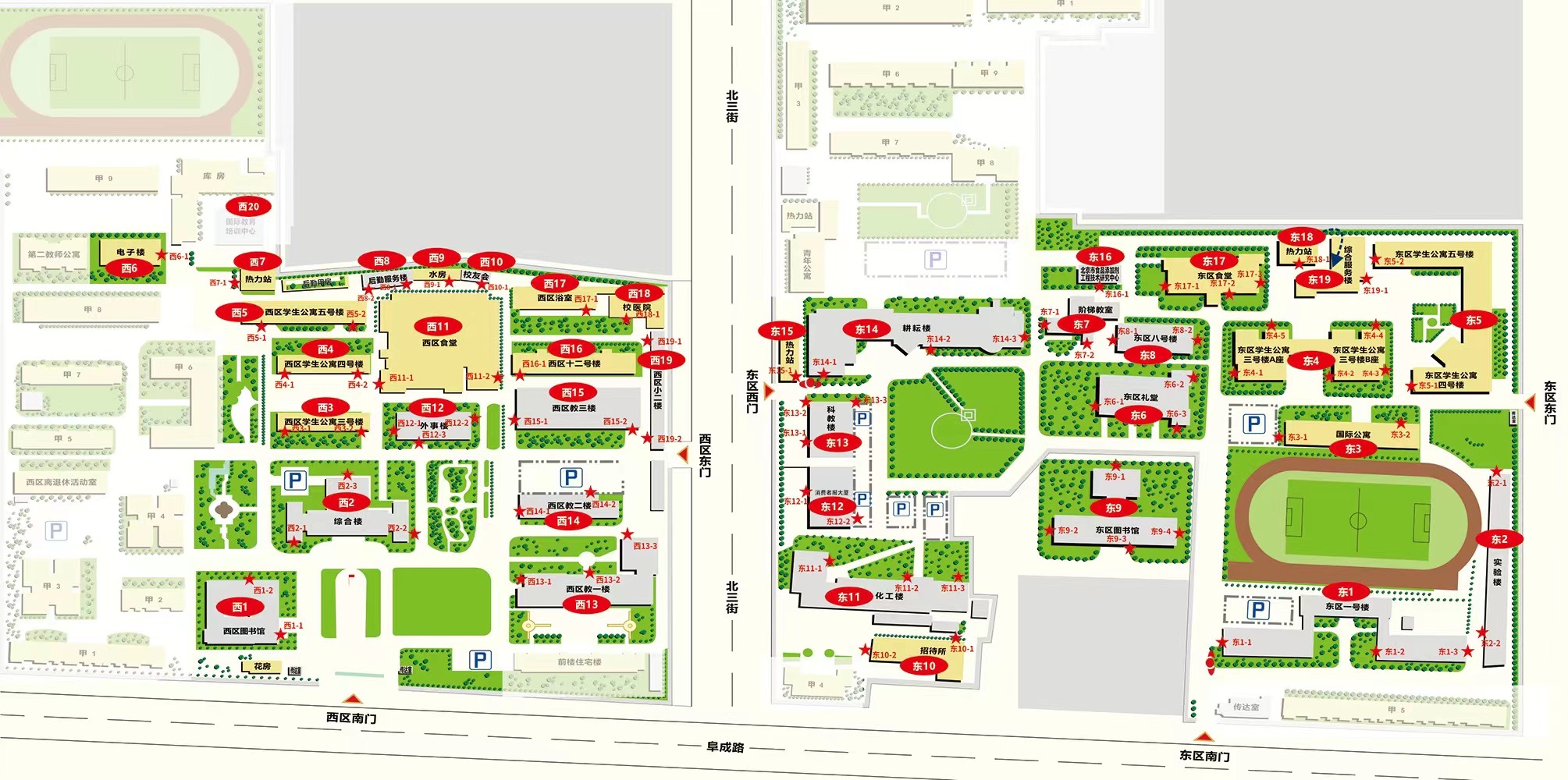 图书馆(西1)、校医院(西18)、水房(西9)、热力站(西7、东15)、浴室(西17)因功能性强,保留原有名称,不做修改。