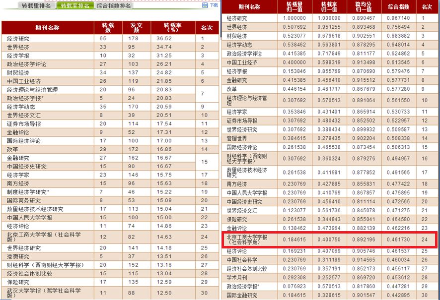 《北京工商大学学报(社会科学版)》2016年度转载量为14篇,在全国各类高等院校主办的1150种学报中排名第48位,在包括《中国社会科学》《经济研究》《管理世界》等权威期刊在内的503种经济类期刊中排名第29位,首次跻身于该类排名的前30位;转载率为17.07%,在1150种高校学报中排名第30位,在503种经济类期刊中排名第24位。