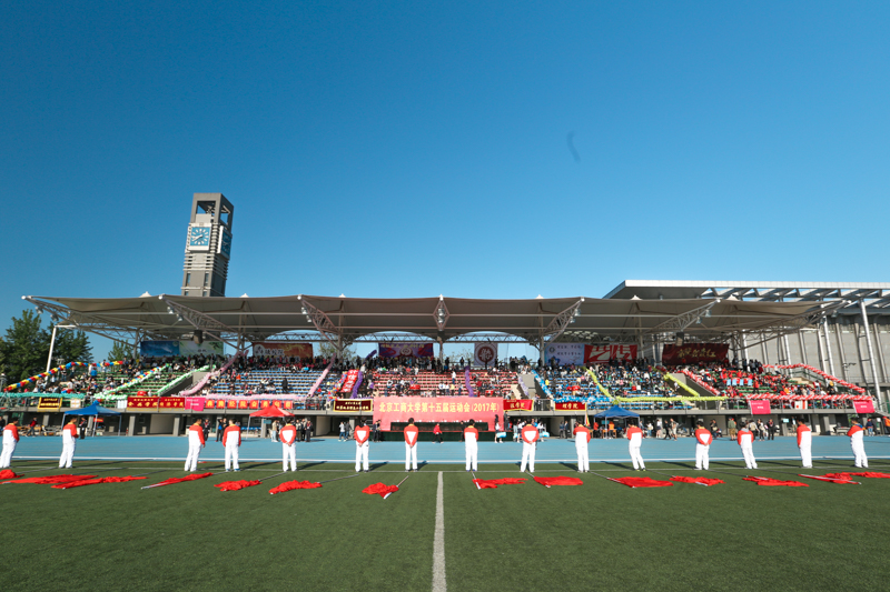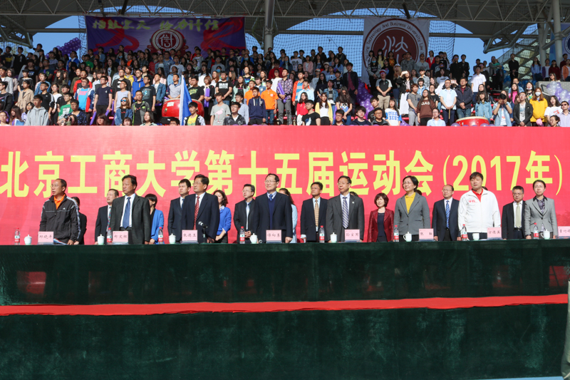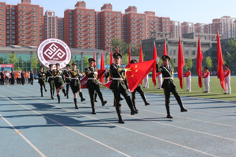 踏着进行曲明快的节拍,由16名国旗手组成的国旗、校旗和校徽方阵走向主席台。旗手们迈着整齐的步伐,精神饱满、英姿飒爽地行进,以斗志昂扬的姿态展现北工商学子蓬勃的朝气。