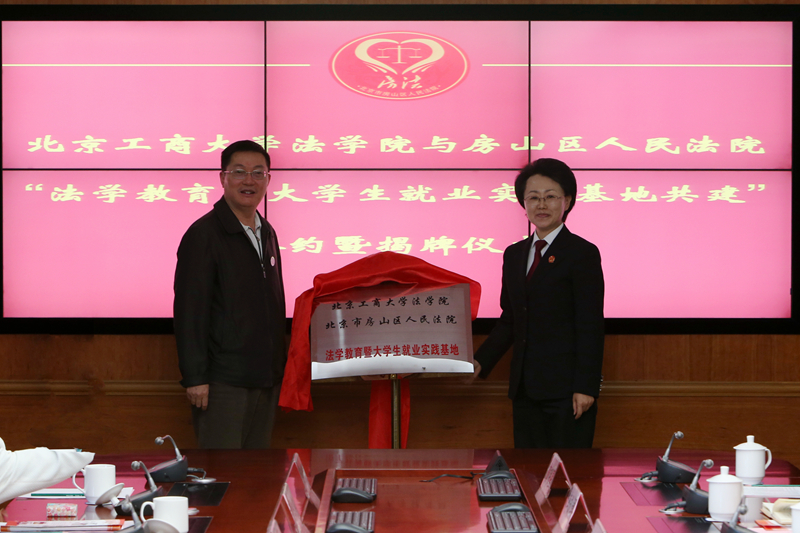 谢安平与邵明艳在共建合作协议书上签字。李朝鲜与邵明艳为法学院与北京市房山区人民法院“法学教育暨大学生就业实践基地”揭牌。邵明艳为我校四位实习生颁发“优秀实习生”证书。我校与房山区人民法院通过学生实习基地共建、重点课题调研合作、双向师资交流、合作开展法律志愿工作等几方面的合作,以“共建”“共管”和“共享”为原则,共同制订实践教学计划,组织实践教学团队开展活动,并共同建设和管理实践基地,形成常态化、规范化和开放共享的新型实践教学基地机制。