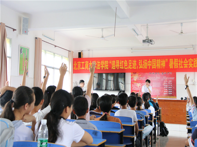 普法调研核心价值观。初入桂林,团员们在枧塘中学许下誓言,此行定当不负众望,弘扬中国精神,传播中国价值。在给枧塘中学的同学们宣扬中国精神,普及法律知识的过程中,团员们不仅锻炼了自己,也增进了对当地情况的了解。通过走访全州县龙达铁合金有限公司,团员们更加深刻的体悟了工匠精神。而针对革命老区的法律普及调研活动也于此正式展开。团员们还结合当地的实际情况,以当地保洁员雇佣合同为例,为村民们普及相关知识,真正做到了学以致用。