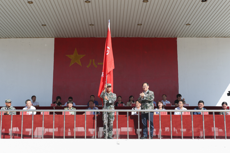 在热烈的掌声中,学校党委书记谭向勇向军训团团长孟立强授团旗。军训团团长孟立强向各营授营旗。