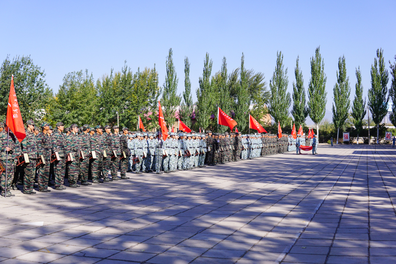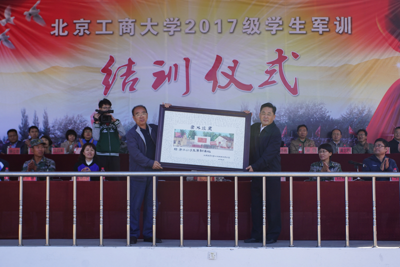 党委副书记张德玉代表学校向承训部队和北京康庄611军训基地分别赠送了锦旗和2017级学生共同创作、包含2600多名学生签名的名为“塞外炉园”的书画作品,表达诚挚的谢意。