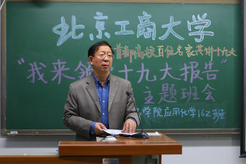 主题班会的一大特色是邀请学校、学院领导走入班级,与学生一起开班会读报告。本次班会邀请到的是校长孙宝国院士,他在同学们分别领读报告后,以微党课的形式与大家分享他自己学习十九大报告的感想。孙校长从同学们所学的应用化学专业实际出发,结合自己在食品和白酒领域的专业研究,从我国社会主要矛盾转化与我们的使命 、食品安全永远在路上 、习近平总书记非常关心食品产业的发展三方面,为同学们解读了十九大精神学习应把握的重点,向同学们提出“以实际行动贯彻落实十九大精神”的要求。