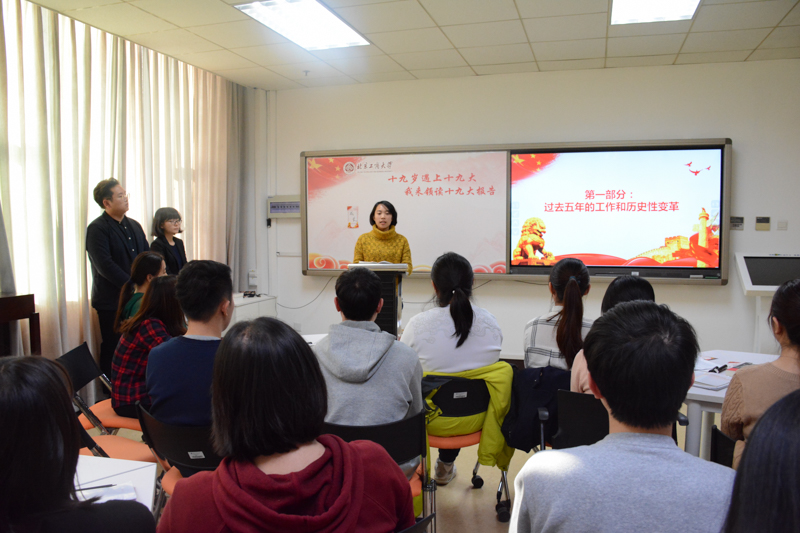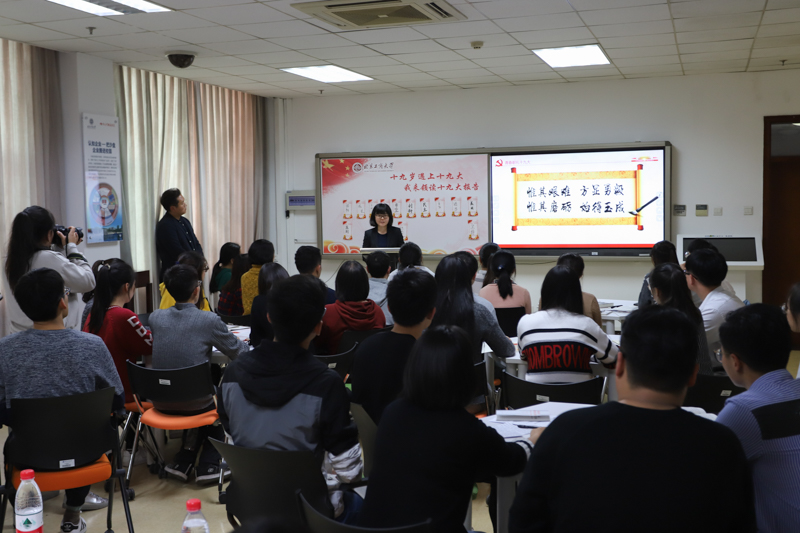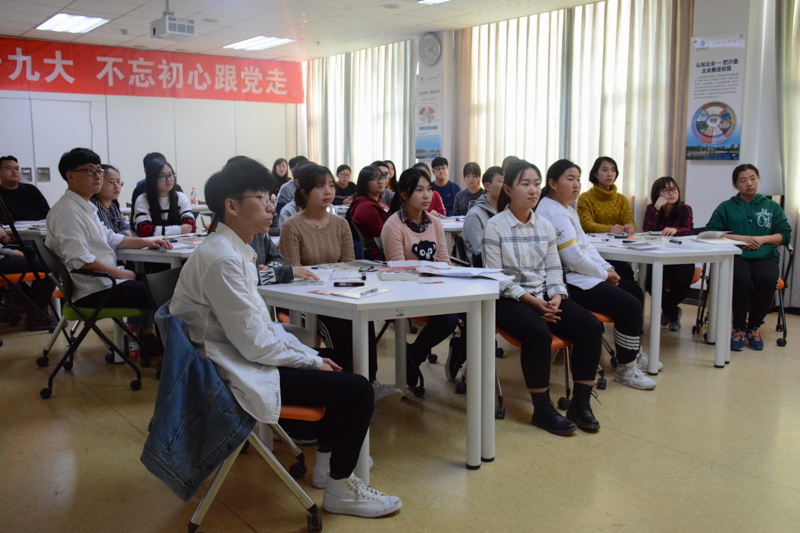 此次班会旨在通过学生原原本本、原汁原味研读、领读党的十九大报告原文,全面深刻准确地学习领会党的十九大精神,交融理论和实际、历史和现实,“学以致用、讲学互动、以讲促学”,以达到真学、真懂、真信、真用的目标。班会由“读”“研”“谈”“思”“学”五部分组成。读:中共十九大会议以及习近平总书记十九大报告内容介绍。研:“我来领读十九大报告”思想交流。谈:不忘初心跟党走,谈如何做优秀大学生。思:总结交流,延伸教育,做到读中思、学中悟。学:认真学习谭书记解读十九大报告微党课。