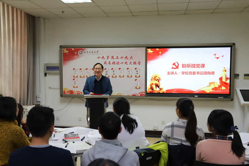 学校党委书记谭向勇来到主题班会现场,为同学们上了一堂解读十九大精神的微党课。他首先向同学们强调了学习十九大精神的重要意义,指出对十九大精神的学习领会需要带着问题学,结合实际学;要认真研读、原汁原味的去体味十九大报告,体会其中的深意。他从青年的使命和责任、我国国情和社会主要矛盾、学生成长成才三个方面展开,并就如何在日常生活和学习中落实党的十九大精神为同学们指明了方向。