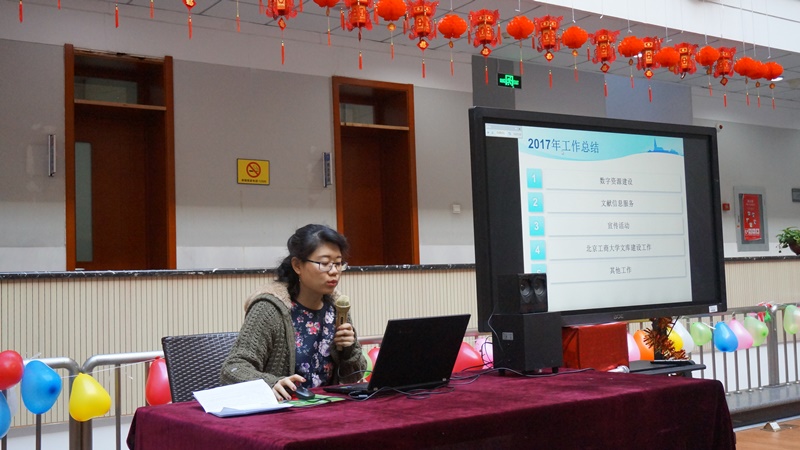 马春晖馆长对2017年工作进行总结。她表示,图书馆在学校党政的正确领导、各兄弟部门的支持配合和党员群众的奋力拼搏下,较好完成了辅助教学科研和人才培养等各项工作,取得一定的成绩,为今后发展奠定了坚实的基础。在新的一年里,图书馆班子将在学校各级领导的关心指引下,继续运用十九大精神指导工作,提高工作能力,树立“大服务观、大数据观、大科学观”,坚持建设以精细化为核心的管理体系和资源利用的绩效评价体系,夯实基础服务和科研服务基础,继续加强人才团队建设、多媒体平台建设、硬件及环境建设。新时代新气象新作为,图书馆人要敢于担当,善于担当,在实践工作当中做出实绩,为使图书馆成为莘莘学子芳华时代的美丽回忆和前进梯航而努力。