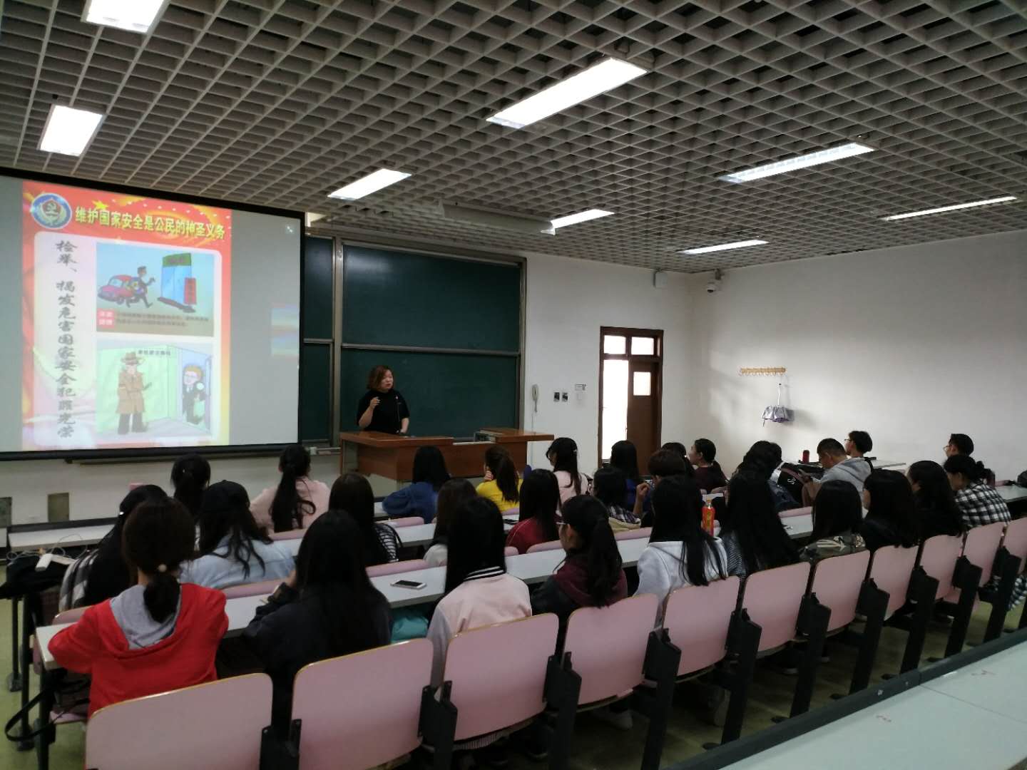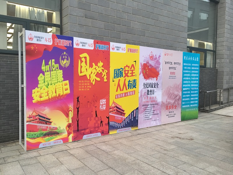 保卫部在两校区布置“4·15护航新时代”主题图片宣传展板和宣传横幅,利用两校区电子大屏滚动播放主题标语,介绍《国家安全法》《反恐怖主义法》《反间谍法》等相关法律知识。