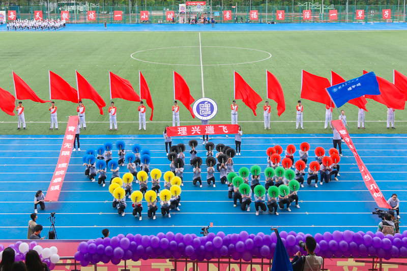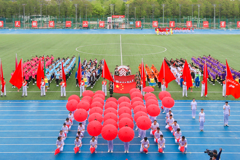 经济学院方队以“一带一路”为主题,结合红绸、黄扇、民族舞,展示人类命运共同体的寓意;商学院方队以红色为“激情”,以黄色为“奋斗”,飞舞的绸带,灵动的剑法谱写着他们对于梦想的赤忱之心;法学院代表团一袭白衣,手握红伞,刚柔并济地展现了运动精神与力量之美;外国语学院红旗招展,精神抖擞,用整齐划一的动作与响亮的口号诠释了新时代下《中国人》的风采;艺传学院方队以整齐的步伐、优美的舞姿、良好的精神面貌证明他们必胜的勇气和力量;马克思主义学院方队由研究生代表组成,他们不仅有严谨求实的学术研究,更有驰骋赛道的勇气。