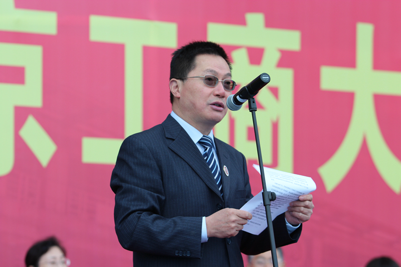 学校党委书记谭向勇宣布“北京工商大学2018年春季运动会”正式开始,并为运动员们打响发令枪。