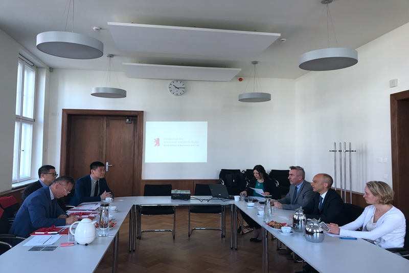 在德国柏林经济与法律学院,谢志华副校长与安德烈亚斯·扎比(Andreas Zaby)校长和哈拉尔德·格拉贝尔(Harald Gleißner)副校长进行会谈。谢志华副校长详细了解了该校的优势学科、办学特色、生源构成等,并介绍了我校的基本情况和未来学校发展方向。双方对两校未来在相关专业领域开展学生及教师交流及科研合作进行了探讨。德国柏林经济与法律学院国际办公室项目主管毕瑞吉纳·奥尔(Birgitta Kröll)和服务部中心主管吉安娜·瑞利夫(Joanna Rieloff)参加了会谈。此外,在德国访问期间,谢志华副校长一行还顺访了中国驻德国使馆教育处,与中国驻德国使馆教育处公参刘立新、教育处一等秘书冯一平进行了会面。