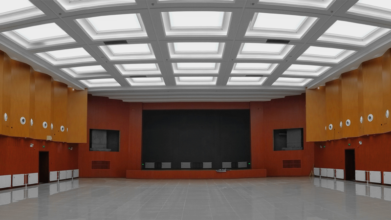 突出细节设计,保证美观实用。将原舞台高度由900mm将低至600mm,保证台上台下通行的便利性及安全性,提升前排观众的可视范围及观演舒适度;采用学校LOGO元素,设计礼堂内部装饰线条,在提升观众厅吸音板墙面层次感的同时,彰显校园文化。