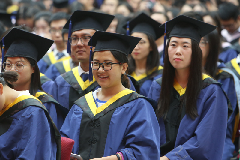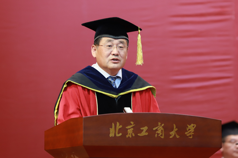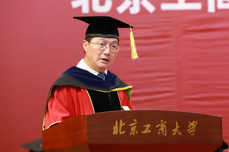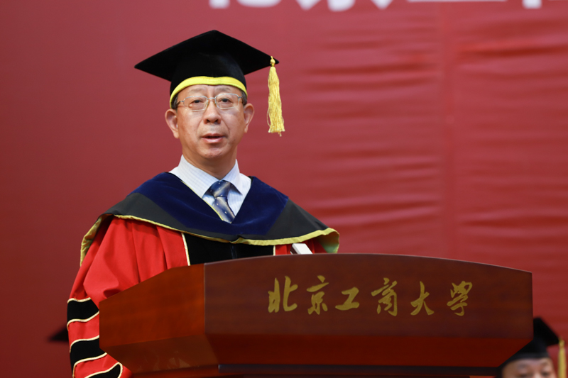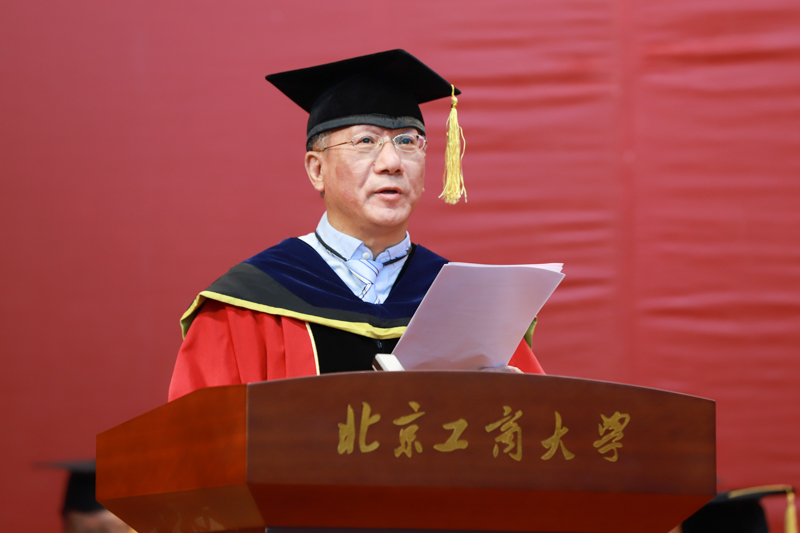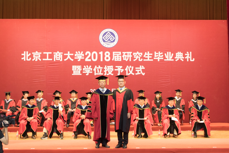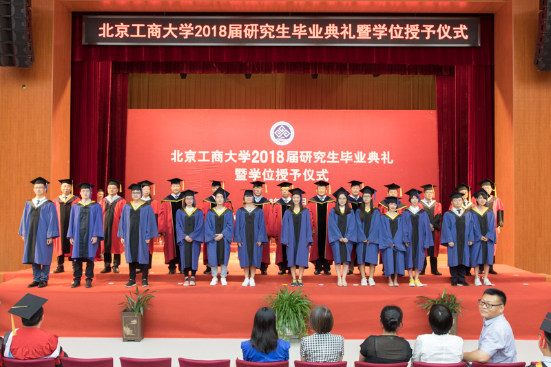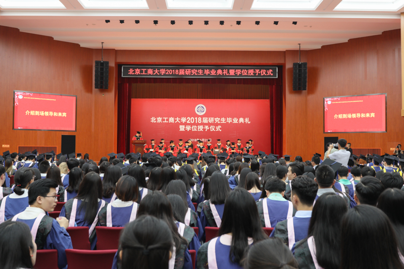 在雄壮的国歌声中,典礼正式开始。副校长谢志华宣读《北京工商大学关于2018届研究生准予毕业及学位授予的决定》,副校长李朝鲜宣读《北京工商大学关于表彰2018届优秀毕业研究生的决定》。2018年,我校共有3名博士生、926名全日制硕士研究生获得毕业证书,共有3名博士研究生被授予博士学位,945名硕士研究生(含非全日制和同等学力)被授予硕士学位;有77名研究生被评为校级优秀毕业生,其中38名研究生被推荐为市级优秀毕业生。
