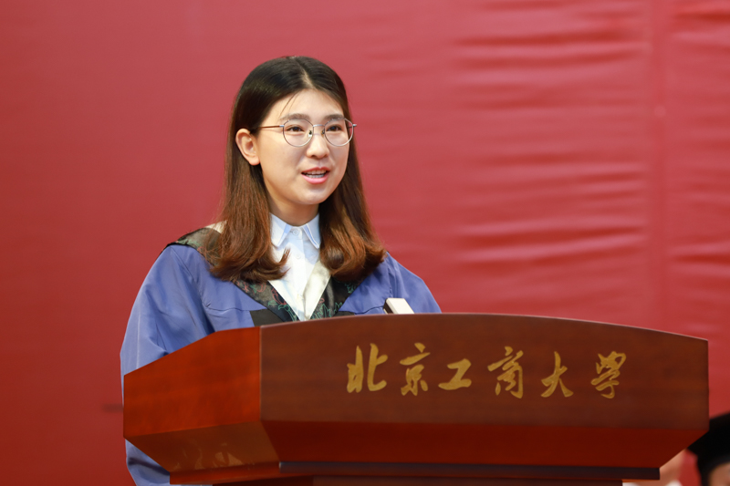 毕业生代表、理学院2018届硕士毕业生杜姜楠在发言中代表全体研究生毕业生对母校的辛勤培育、老师的殷切教导表示衷心的感谢。她回顾了在校学习、生活的点点滴滴,感谢母校这片热土提供给广大研究生宽广的平台,并表示为母校取得博士学位授予点感到骄傲和自豪。她用九个感谢和自己谱写的一曲《北工商》歌词表达对母校的依依惜别之情,勉励毕业生们在实现自我价值的同时,为祖国的繁荣昌盛、为新时代的蓬勃发展贡献一份自己的力量。