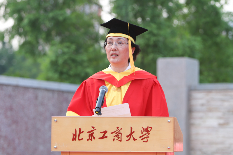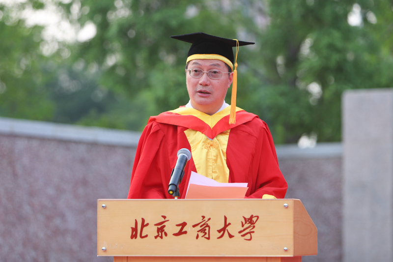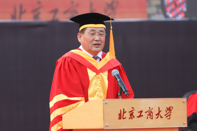 校长孙宝国院士在发言中代表学校党政向2018届本科毕业生表示最热烈的祝贺,向潜心培育学子们的老师和关心、帮助、支持学子们的亲朋好友,致以崇高的敬意和亲切的问候!孙校长谈到,2014级学生是他走上校长岗位迎来的第一届新同学,也是完整经历了“千人大考”历练的第一届学子,经过四年磨砺,同学们已经成长成为有理想、有学识、有担当的时代青年。毕业生中24人次获得国家奖学金、25人被评为“北京市三好学生”、136人被评为“北京市优秀毕业生”;398人次在市级、国家级甚至国际上的学科竞赛中获奖,395人次获得市级以上体育奖项;考研出国率达到27.32%。孙校长寄语毕业生们要牢记习总书记的教诲:“青年时代,选择吃苦也就选择了收获,选择奉献也就选择了高尚。”要担负起实现中华民族伟大复兴中国梦的历史使命,必须有“先天下之忧而忧,后天下之乐而乐”的胸怀,培养良好的合作精神。他希望同学们牢记和践行北工商“求真、立德、勤奋、创新”的校训,奋发有为, 敢于担当,为母校添彩、为祖国增辉,并祝同学们事业成功,家庭幸福!