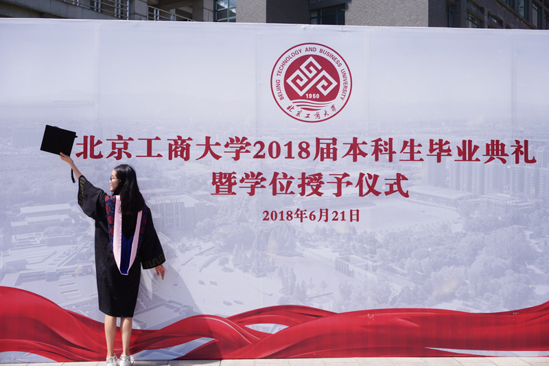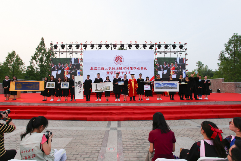 伴随着激昂的乐曲声,学位授予仪式开始。脸上洋溢着自信的笑容,散发着青春气息的毕业生们依次走上主席台,由校领导和学位委员会委员为他们扶正流苏、授予学位,并合影留念。当学位帽上的流苏被从右到左轻轻拨过,2018届毕业生从师长手中接过大学时光不懈耕耘的收获,对着镜头留下大学四年最美好的青春记忆,为求学历程划上圆满句点,去迎接未知的精彩未来。从此,北工商又添校友;从此,聚散心系母校。